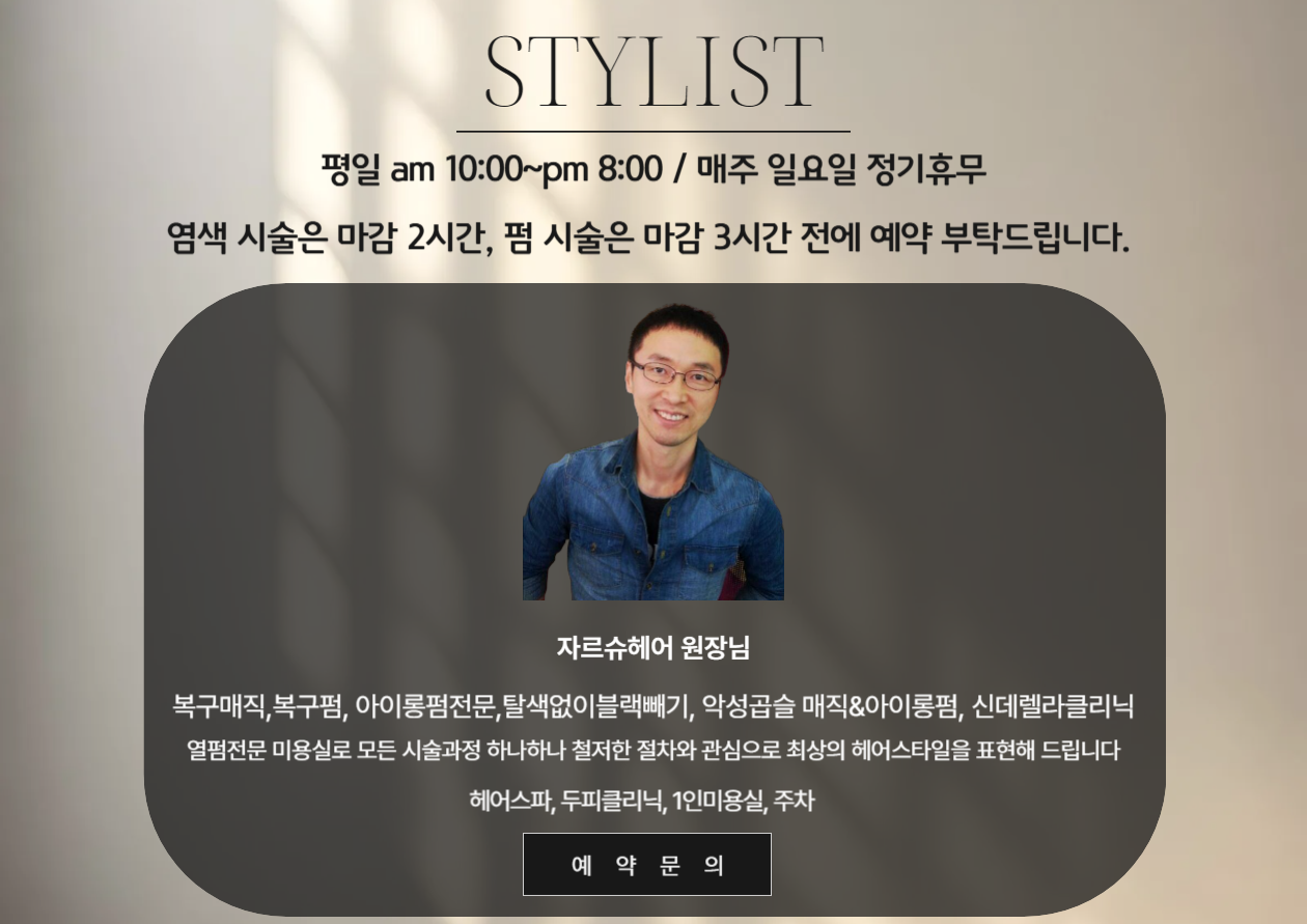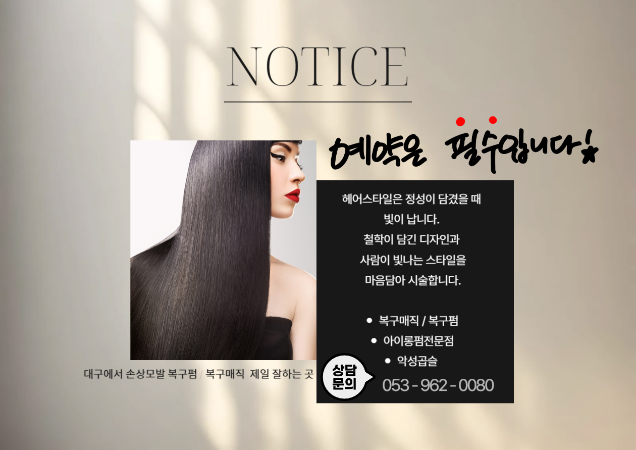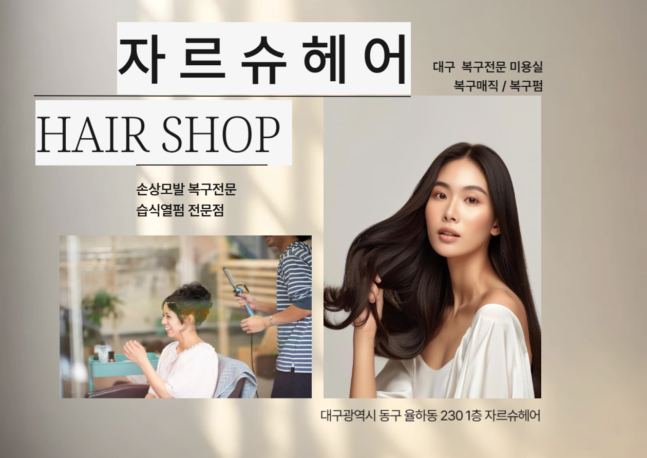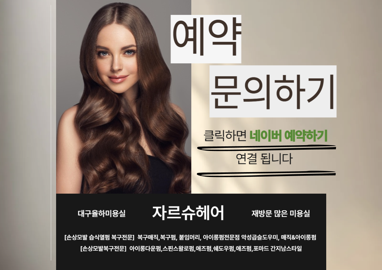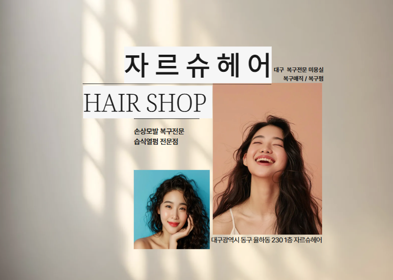 대구 동구 율하에 위치한 미용실로, 손상모발 복구펌, 복구매직, 열펌을 전문으로 합니다. 여성분들을 위한 파마와 남성분들을 위한 펌 및 컷트 서비스를 제공합니다.