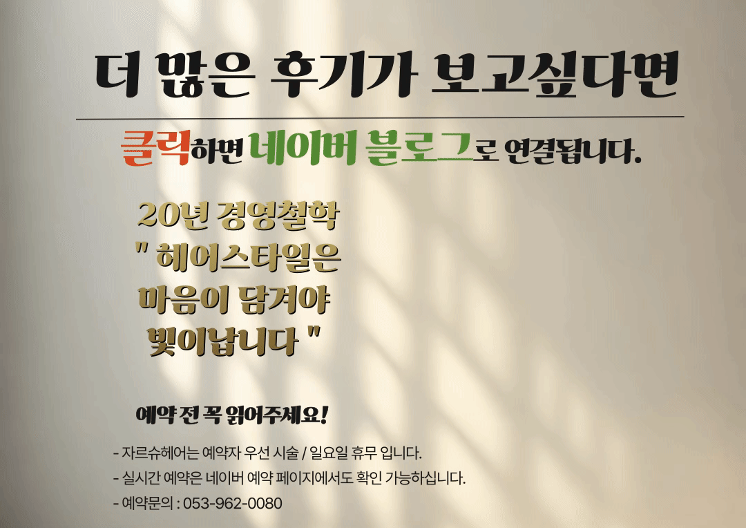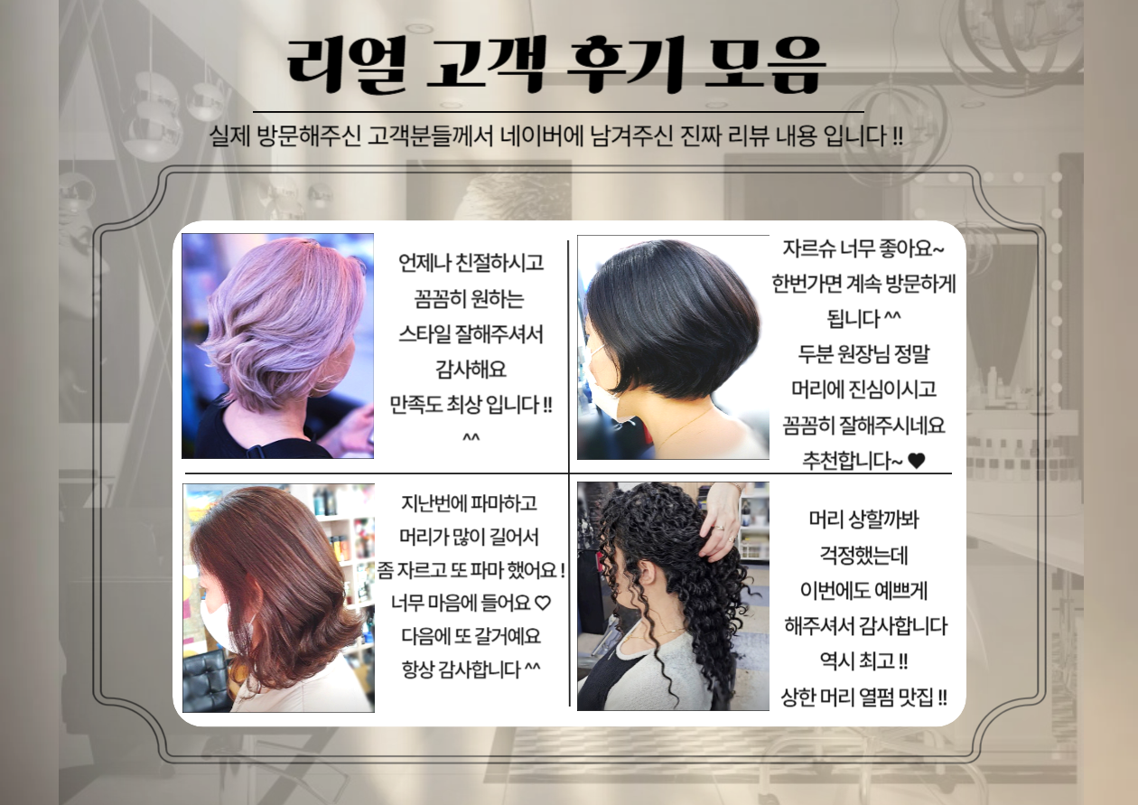 고객님들의 소중한 후기를 통해 저희 미용실의 서비스를 확인하실 수 있습니다. 만족스러운 시술 경험을 위해 최선을 다하고 있습니다.