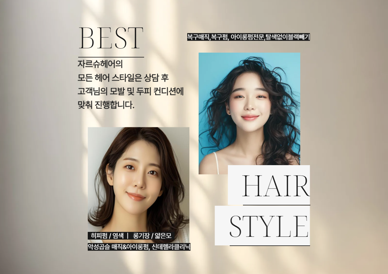 강한 곱슬머리나 손상된 모발을 가진 분들을 위해 복구매직 서비스를 제공합니다. 복구매직은 모발을 부드럽고 매끄럽게 만들어주며, 손상 없이 자연스러운 스트레이트 헤어를 연출합니다.